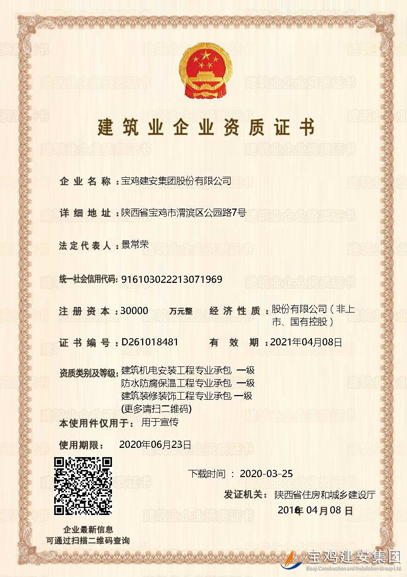 近日,公司資質(zhì)工作再傳捷報(bào),經(jīng)陜西省住房和城鄉(xiāng)建設(shè)廳等主管部門核準(zhǔn),公司申報(bào)的環(huán)保工程專業(yè)承包一級資質(zhì)、電力工程施工總承包二級資質(zhì)成功獲批。